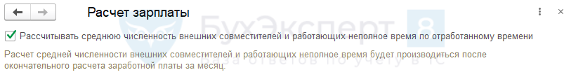 При необходимости новый механизм расчета средней численности можно отключить и применять прежний алгоритм – по отработанным дням и ставкам сотрудников. В Настройках расчета зарплаты (Настройка – Расчет зарплаты) появился флажок Рассчитывать среднюю численность внешних совместителей и работающих неполное время по отработанному времени. Если он сброшен, применяется прежний механизм.