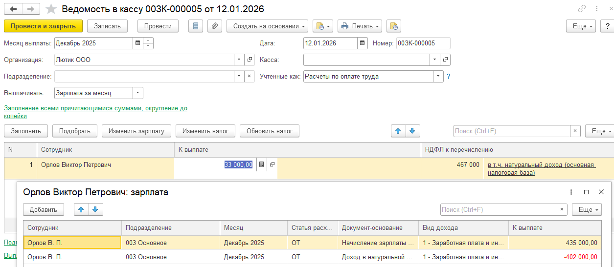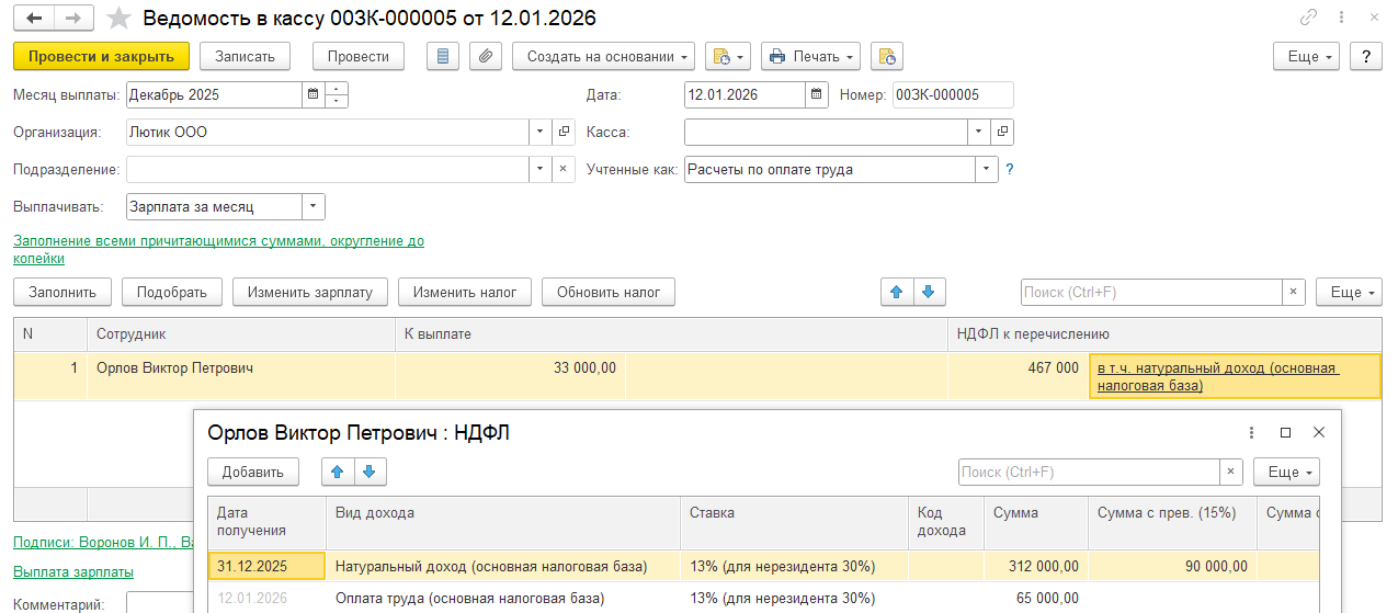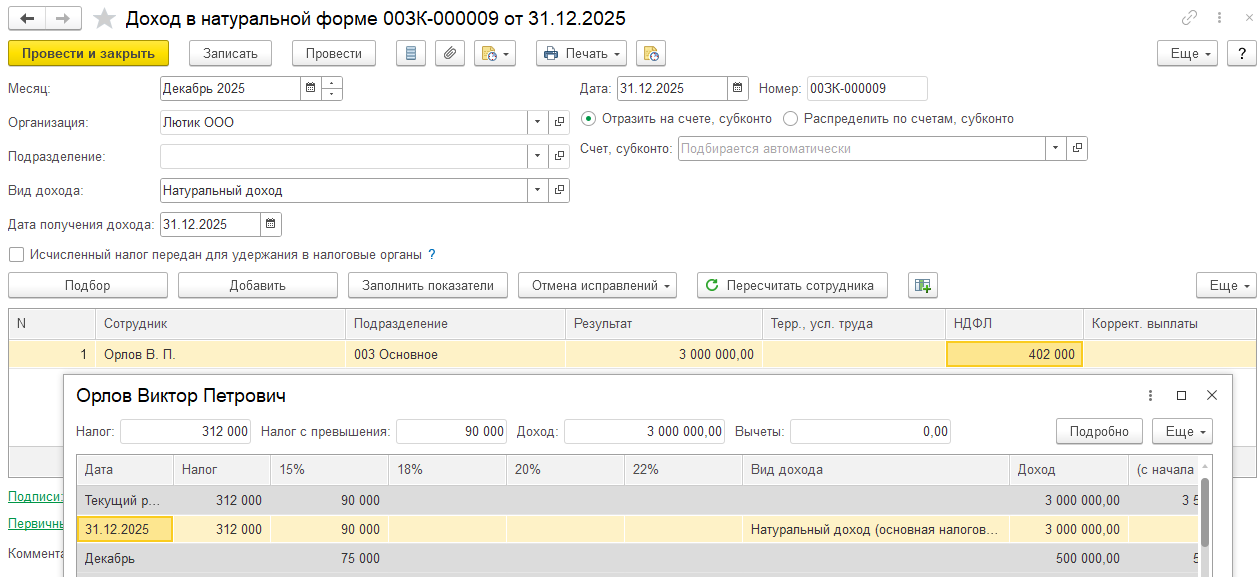 Предположим 31.12.25 мы начислили сотрудник натуральный доход: