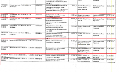 Сейчас поясню, что она делает. В момент проведения документа Больничный лист АпЗК-000012, в котором сторнируется отпуск, этот сторно-отпуск в регистре «Учет доходов по страховым взносам» относится к июлю (колонка «Дата получения дохода»=31.07.2018 на сумму -12 399,69), т.е. к тому месяцу, в котором он был начислен (на приарепленном скрине обозначил цифрой 1). Это происходит по причине того, что в сентябре (в месяце, когда регистрируется этот больничный) нет другого облагаемого дохода, который мог бы компенсировать этот сторно-доход.