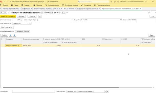 Проводим документ, но не закрываем. Переходим на вкладку Исчисленные взносы и нажимаем кнопку Рассчитать. Программа сама должна рассчитать взносы. Проводим и закрываем документ.