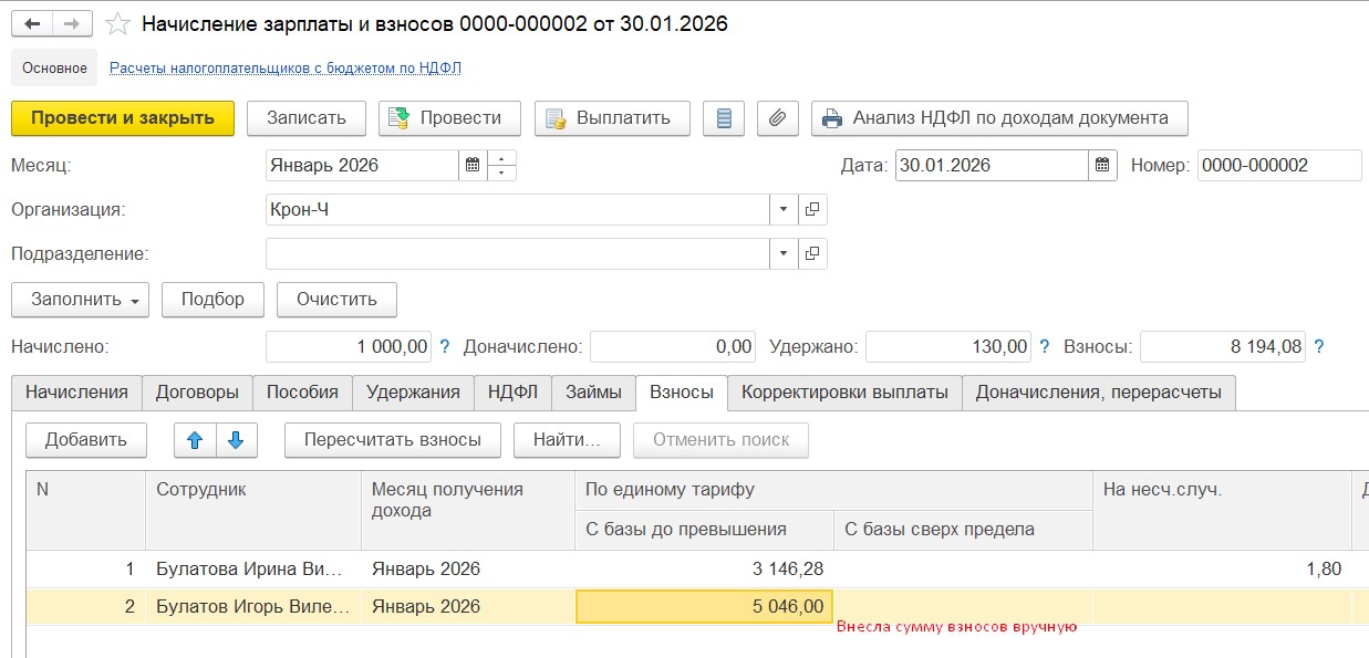 Но в Начисление зарплаты и взносов во вкладу «Взносы» по кнопке «Заполнить» добавляется только Новый руководитель.