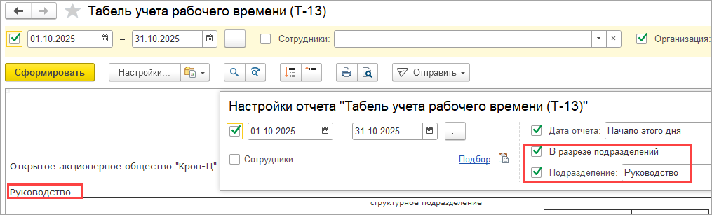 Почему в отчете Табель учета раб. времени (форма т-13) не выводится наименование структурного подразделения? При том, что отчет сформирован с отбором по подразделению.