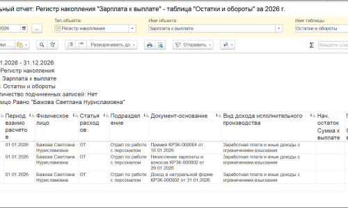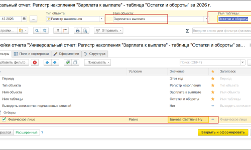 И сформируем Универсальный отчет по регистру Зарплата к выплате видом Остатки и обороты, с отбором по физлицу за 2026 год