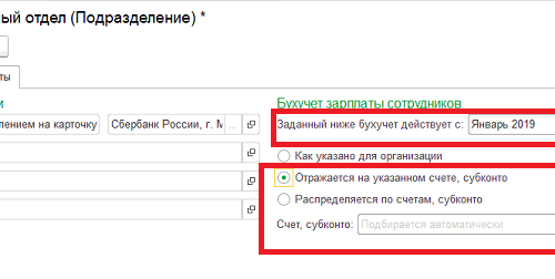Здравствуйте! Что касается отнесения зарплаты по подразделениям, Вам нужно в справочнике Подразделения (раздел Настройка — Подразделения) заполнить способы отражения зарплаты и указать период, с которого они будут действовать. Пример показан на скриншоте. Принцип отражения способов учета в программе ЗУП и Бухгалтерия можно посмотреть в статье — Почему в справочнике «Способы отражения в учете» не указываются счета и субконто бух.учета? . После указания способов необходимо перезаполнить документ Отражение зарплаты в бухучете.