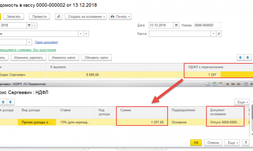 «При проведении ведомости на выплату отпуска, сумма выплаты подтягивается отпуска, а документ-основание начисление з/п от 31.10.2018» — то есть Вы имеете ввиду, что в ведомость сумма к выплате подтягивается правильно, именно по отпуску, а сумма в колонке «НДФЛ к перечислению» неправильно — НДФЛ с отпускных не подтягивается, а загружается сумма НДФЛ исчисленная с зарплаты за октябрь. Я правильно понял?
