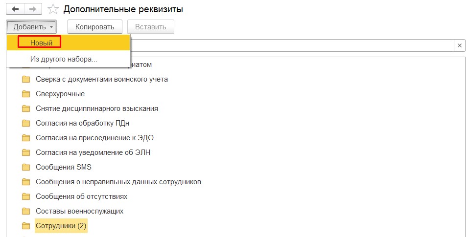 Переходим по ссылке Дополнительные реквизиты и находим в столбце слева реквизит Сотрудники. Становимся на него и выбираем команду Добавить — Новый