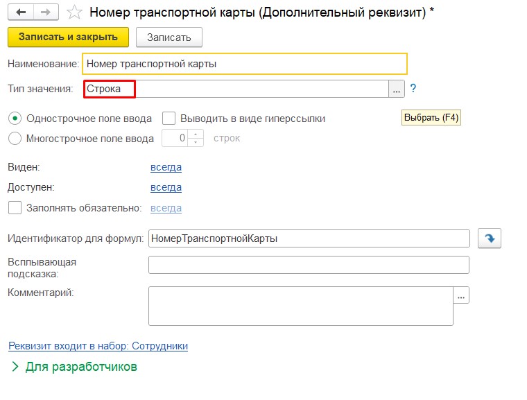 Заполняем первый доп реквизит: укажем наименование Номер транспортной карты, выбираем тип значения — Строка