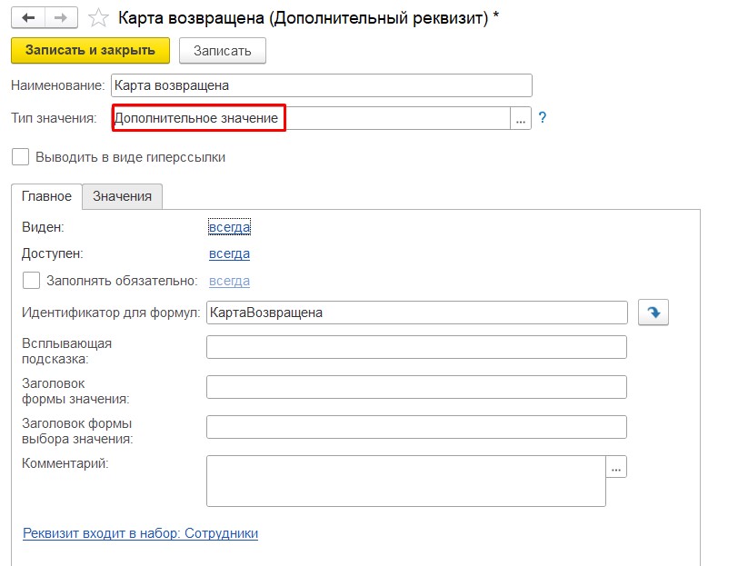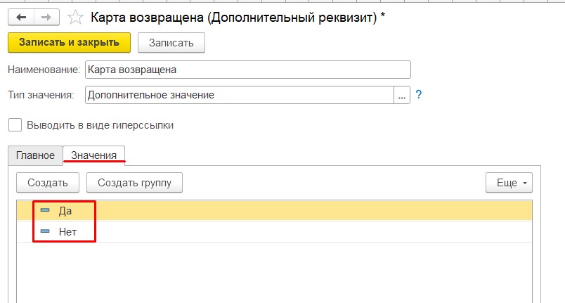 Второй доп реквизит: наименование Карта возвращена, тип значения — Дополнительное значение.