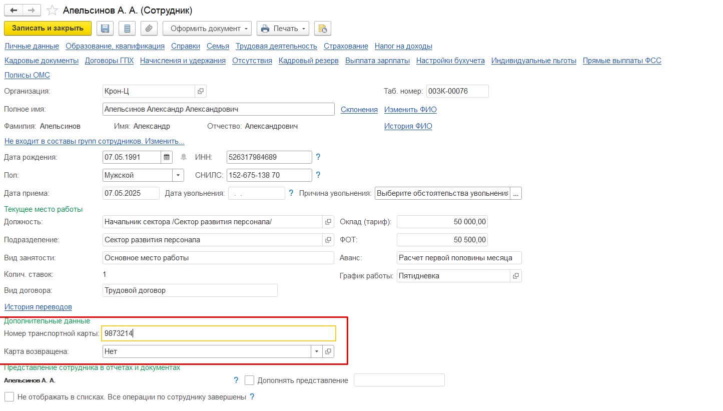 В результате в карточке сотрудника появится два поля, которые нужно будет заполнять. Когда сотруднику только выдана карта, заполняем в карточке сотрудника ее номер и выбираем,что она не возвращена.