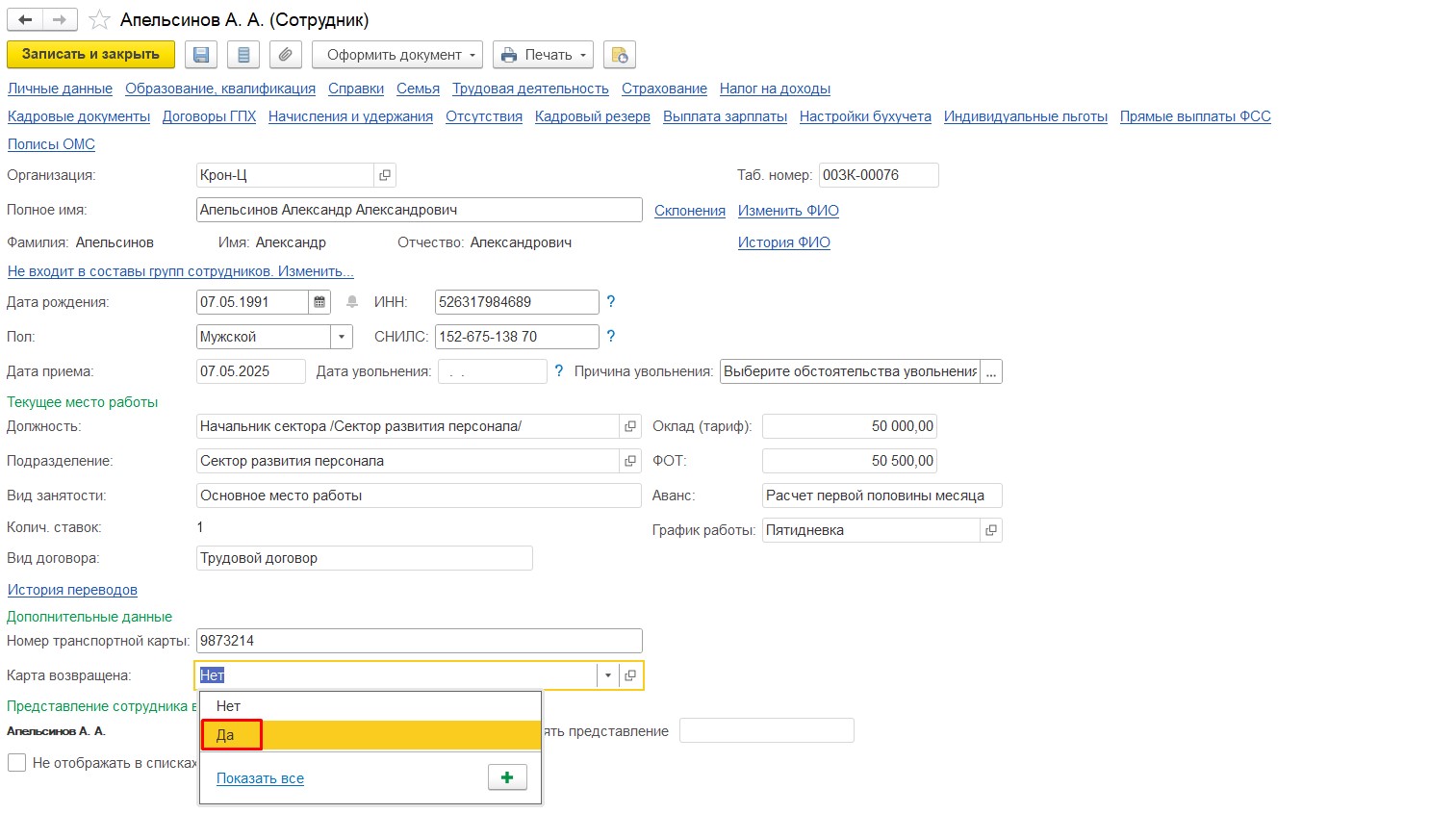 Когда сотрудника увольняем, снова идем в карточку сотрудника и меняем для реквизиты Карта возращена с Нет на Да.