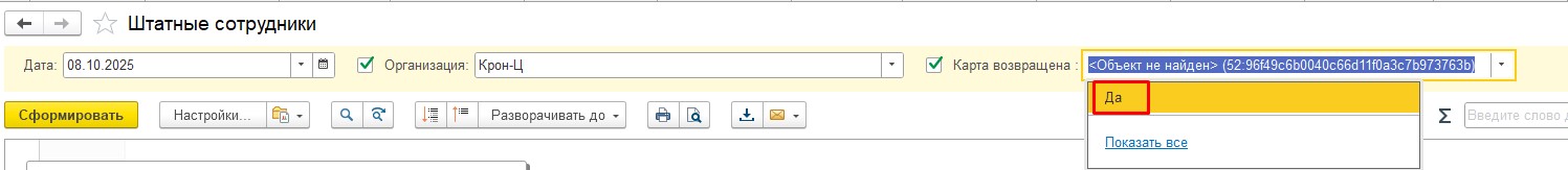 В шапке добавила отбор по признаку возврата карты, он отработает по тем сотрудникам, у которых в карточке заполнены значения Да или Нет.