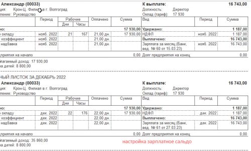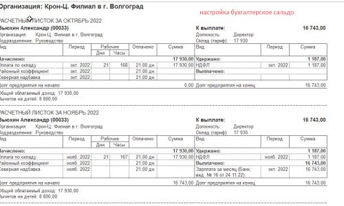 Если обратить внимание на расчетный листок ноября. Если сальдо на начало, есть выплата. Выплата указана за ноябрь. Если Вы в ведомости указываете будущий месяц для того чтобы увидеть бухгалтерское сальдо, то это можно сделать настройками. Прикладываю публикацию: Как в рамках одного зарплатного отчета увидеть и зарплатное, и бухгалтерское сальдо .