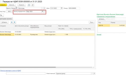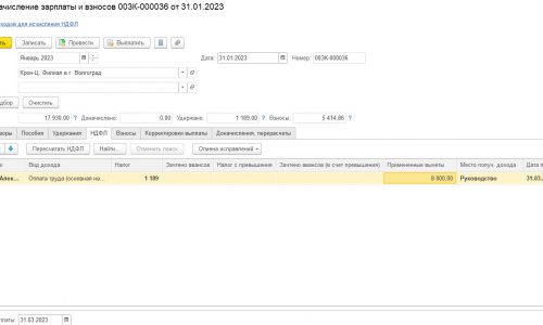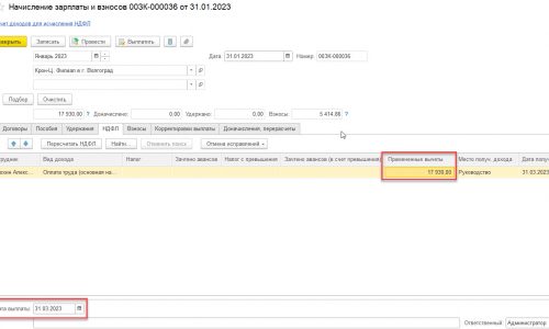 В 2023 году провела документ Начисление ЗП за январь 2023 с датой выплаты 27.02.2023, в регистре учета НДФЛ за 2023 год отобразились суммы на дату 27.02.2023 — доход 17930 руб., НДФЛ исчисленный в сумме 43 руб., вычеты февраля 2023 в размере 8800х2=17600 руб.