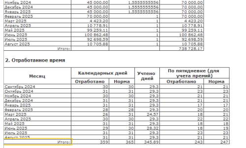 Пример, который я смоделировала, следующий. Сотрудник принят на работу 09.08.2024. Премия в 20000 – полностью учитываемая. Премия 25000 – частично учитываемая. Обе премии начислены за 2024 год в апреле 2025.