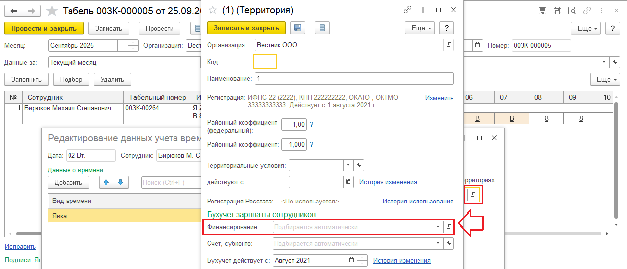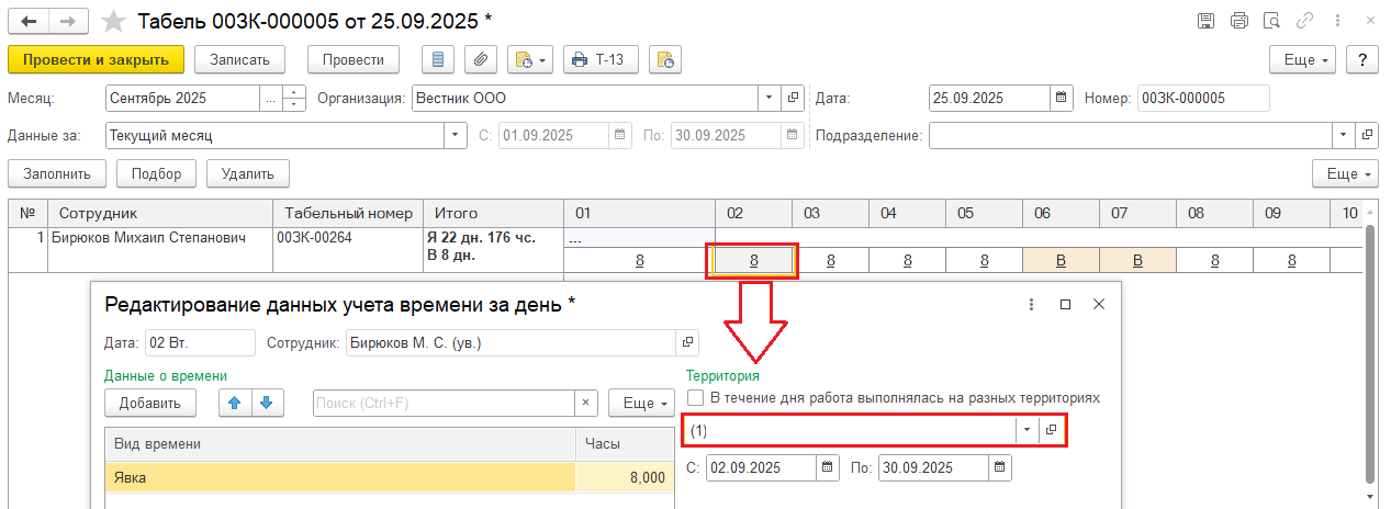 Тогда можно будет прямо в документе Табель учета рабочего времени указывать территорию: