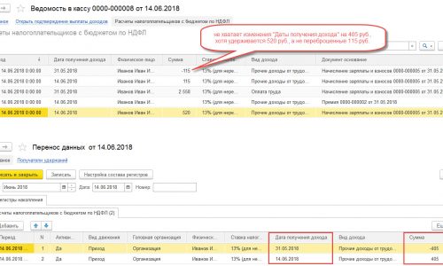 Исправить ситуацию можно следующим образом: внести через документ «Перенос данных» по регистру накопления «Расчеты налогоплательщиков с бюджетом по НДФЛ» перебросить сумму 405 руб. с 31.05.18 на 14.06.18 (31.05.18 сумму с минусом, 14.06.18 — сумма с плюсом). Движения должны быть точно такие же как «Ведомости в кассу №8 от 14.06.18» по сумме 115 руб. (скриншот прилагаю).