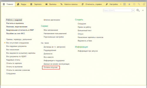 «документом «Ввод остатков отпусков»» — уточните, пожалуйста, где это?» — я так понимаю Вы не можете найти сам документ. Раздел «Главное» — «Остатки отпусков» (приложил скрин)