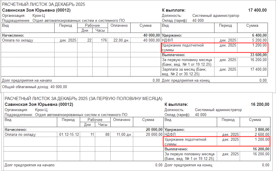 Удержание в аванс происходит в порядке зачета. Поэтому при расчете зарплаты за месяц удержанная сумма заполняется на вкладке удержания и отражается в расчетном листке за первую половину месяца и за месяц в целом. В итоге за месяц удержание происходит один раз.