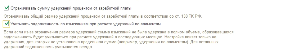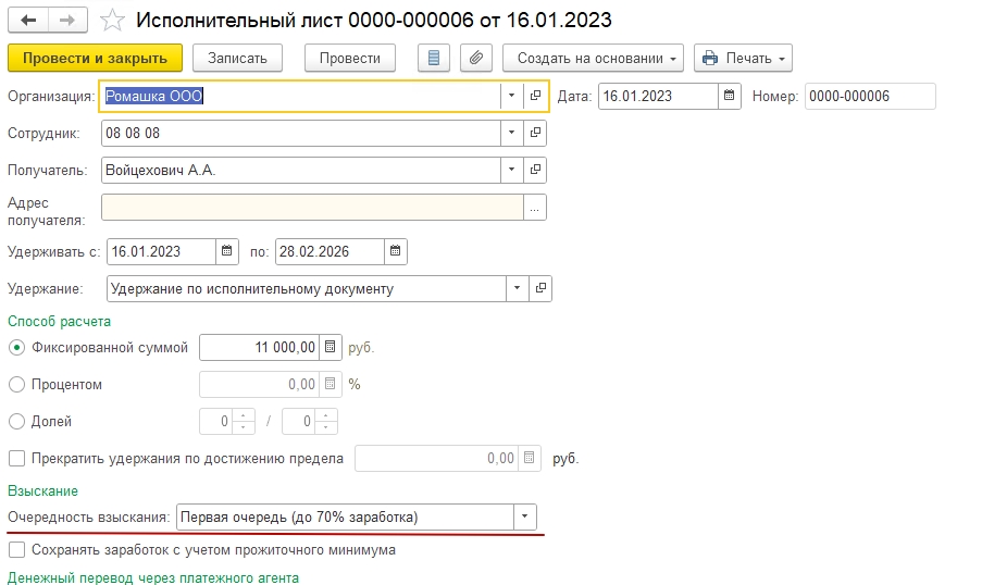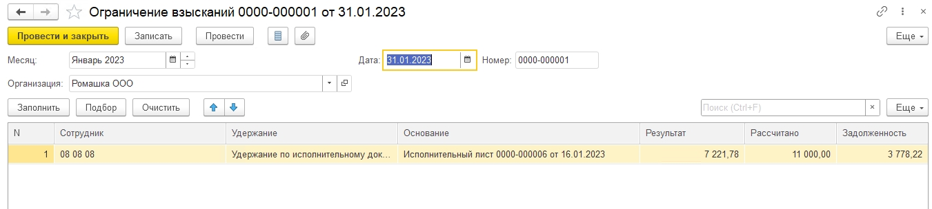После проведения зарплаты создаем документ Ограничение взысканий (Зарплата — Ограничения взысканий), где программа уменьшает на процент очередности.