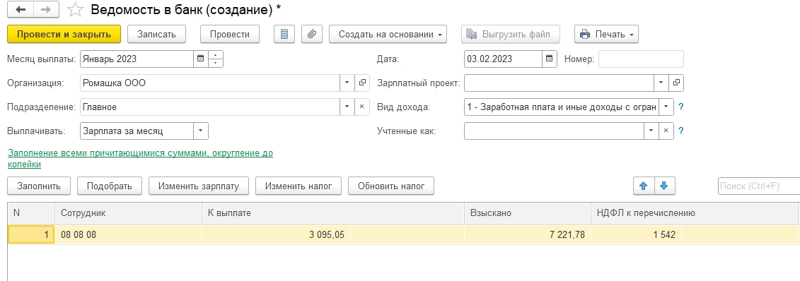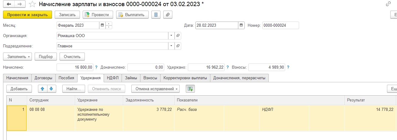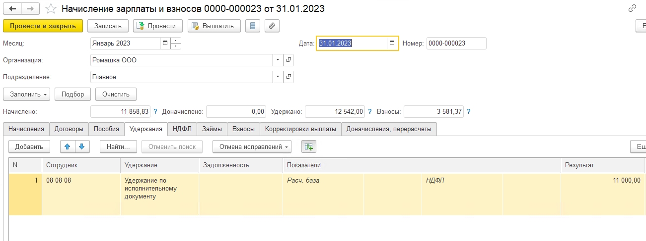 Далее начисляем зарплату, но там указывается полная сумма взыскания.