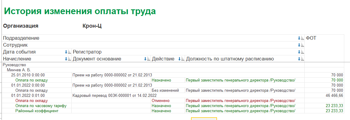 Добрый день! Посмотрите, пожалуйста, в разделе Зарплата — Отчеты по зарплате не подойдет ли типовой отчет История изменения оплаты труда?