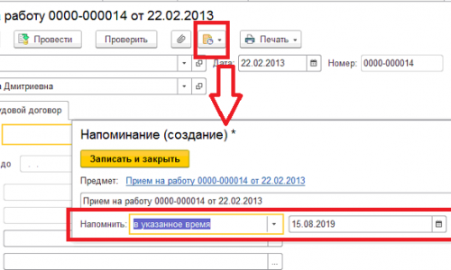 Здравствуйте! Можно настроить напоминание в программе. Для этого нужно зайти в раздел Администрирование — Органайзер — Заметки, напоминания, анкетирование, шаблоны сообщений и поставить галочку «Напоминания». После этого в документе Прием на работу создать напоминание, пример на скриншоте. В указанное время в программе появится сообщение.