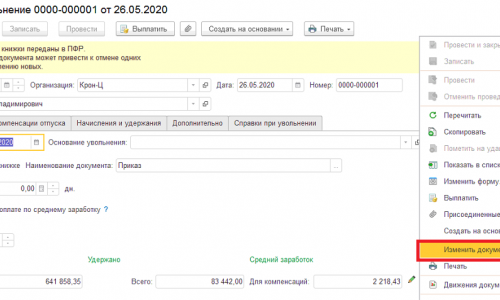 3. Документ «Увольнение» стал недоступен для редактирования. Нажала кнопку «Изменить документ» (показано на скриншоте), перезаполнила закладку «Начислено», провела документ.