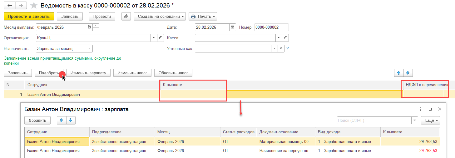 — Далее можно сформировать техническую ведомость в кассу, чтобы закрыть пересортицу по документам-основания ( по кнопке Подбор добавить сотрудника, при этом сумма к выплате и НДФЛ — ноль, но внутри закрывается пересортица — это можно увидеть нажав на кнопку «Изменить зарплату»):