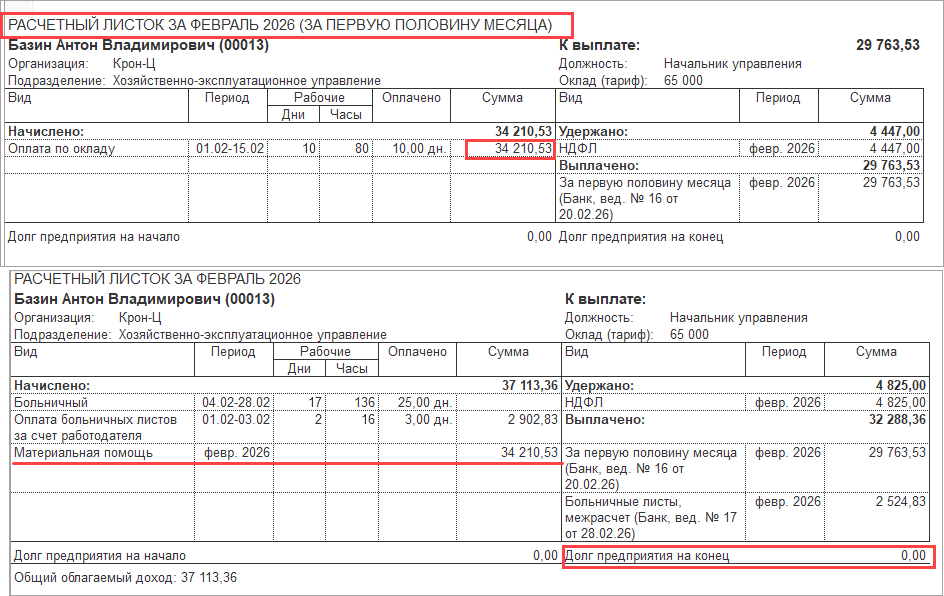 1. Для исправления ошибки, когда зарплата за месяц меньше аванса предлагаю использовать способ 3 из статьи с двумя с техническим начислением Ошибка в ЗУП 3.1 если зарплата за месяц меньше аванса В этом случае не нужно исправить начисление за первую половину февраля.