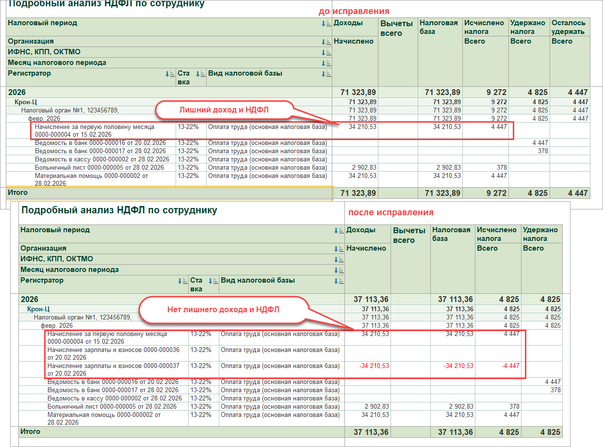 После исправления ошибки у нас не только в РЛ (расчетном листке), но и в подробном анализе НДФЛ не будет отражаться доход по авансу.