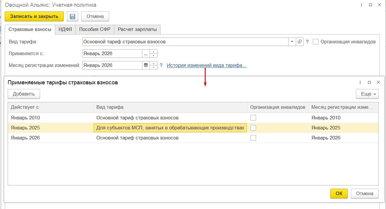 С 01.01.2026 года компания потеряла право на сниженную ставку страховых взносов (в классификаторе ОКВЭД 73 отсутствует). В ЗУП в УП с января 2026 внесли изменения с «Для субъектов малого или среднего предпринимательства» на «Основной тариф страховых взносов» (см. скрин)