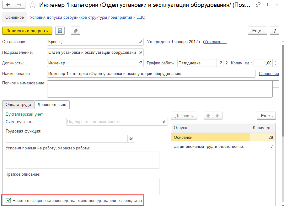 В данном случае есть нюанс. Если ведется штатное расписание, то нужно установить флажок «Работа в сфере растениеводства, животноводства и рыбоводства» непосредственно в карточке позиции штатного расписания. НЕ через документы Изменения штатного расписания, а как показано на скриншоте ниже непосредственно в карточке позиции штатного расписания для соответствующей должности: