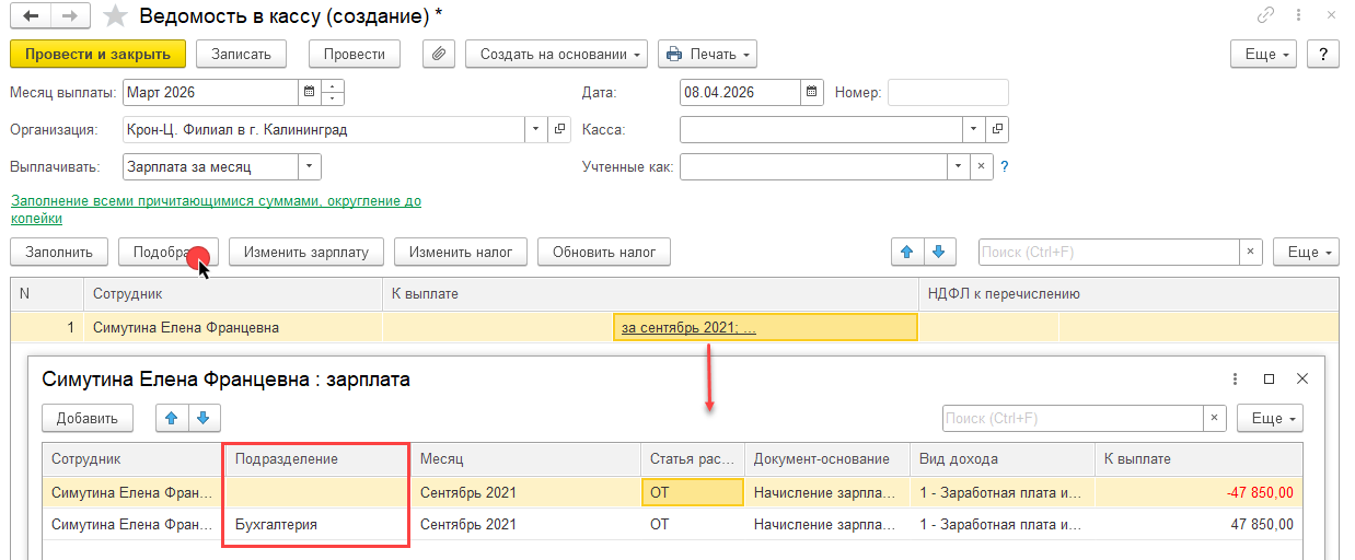 Попробуйте создать техническую ведомость в кассу и по кнопке Подбор добавить сотрудника.