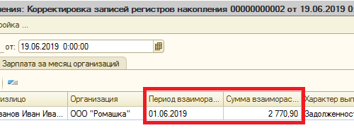 Здравствуйте! Необходимо зайти в раздел Операции — Документы — Корректировка записей регистров накопления и создать документ. По кнопке «Настройка» отметить галочками два регистра «Взаиморасчеты с сотрудниками организаций» и «Зарплата за месяц организаций». Далее на каждой вкладке документа заполнить данные как указано на скриншоте — период и сумму (с «+» или «-«) подберёте опытным путем.