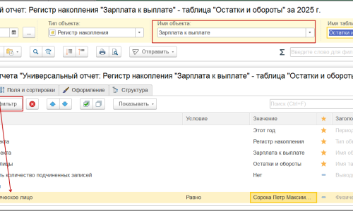 Давайте с вами проверим регистр Заплата к выплате, для этого сформируем Универсальный отчет по регистру с видом остатки и обороты, и добавим отбор по нашему физику