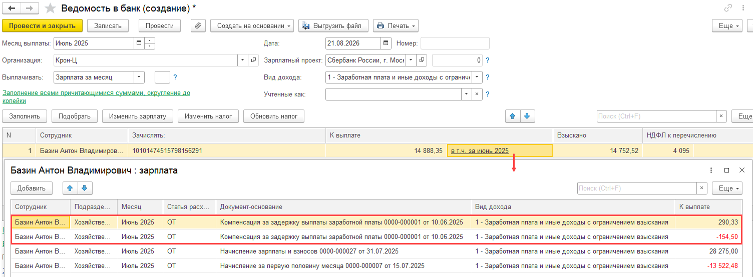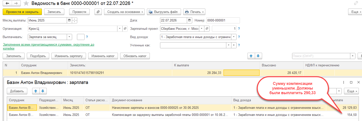 Смоделировала в демо базе похожую ситуацию, когда в ведомости скорректировали сумму к выплате и не выплатили полностью компенсацию за задержку заработной платы.