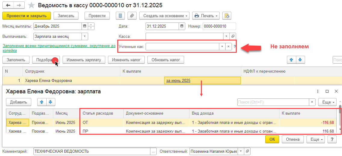 Поэтому предлагаю создать техническую ведомость в кассу и подбором добавить сотрудницу (ведомость в кассу можно заполнить сразу по всем статьям расхода)