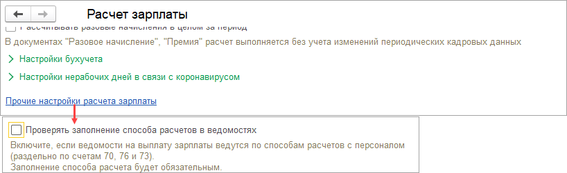 Чтобы была возможность не заполнять поле «Учтенные как» откроем меню Настройка — Расчет зарплаты — и снимем флажок «Проверять заполнение способа расчетов в ведомостях» (после корректировки настройку можно вернуть назад).