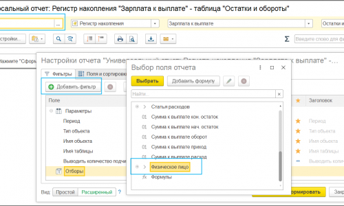 давайте сформируем с проведенной ведомостью декабря Универсальный отчет по регистру Зарплат к выплате с видом «остатки и обороты» с отбором по физ лицу