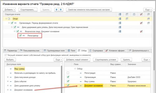 Перед заполнением «Ведомости в кассу» можно проверить не попала ли информация по документу «Разовое начисление» в другую Ведомость. Для анализа воспользуйтесь отчетом «Проверка разд. 2 6-НДФЛ» (раздел Налоги и взносы — Отчеты по налогам и взносам — Проверка разд. 2 6-НДФЛ). Через кнопку Еще — Прочее — Изменить вариант отчета в группировке отчета добавьте поле «Регистратор» (это будут Ведомости), а на вкладке «Отбор» для поля «Документ основание» выберите документ «Разовое начисление» (скриншот прилагается). Период задайте весь 2018 г.