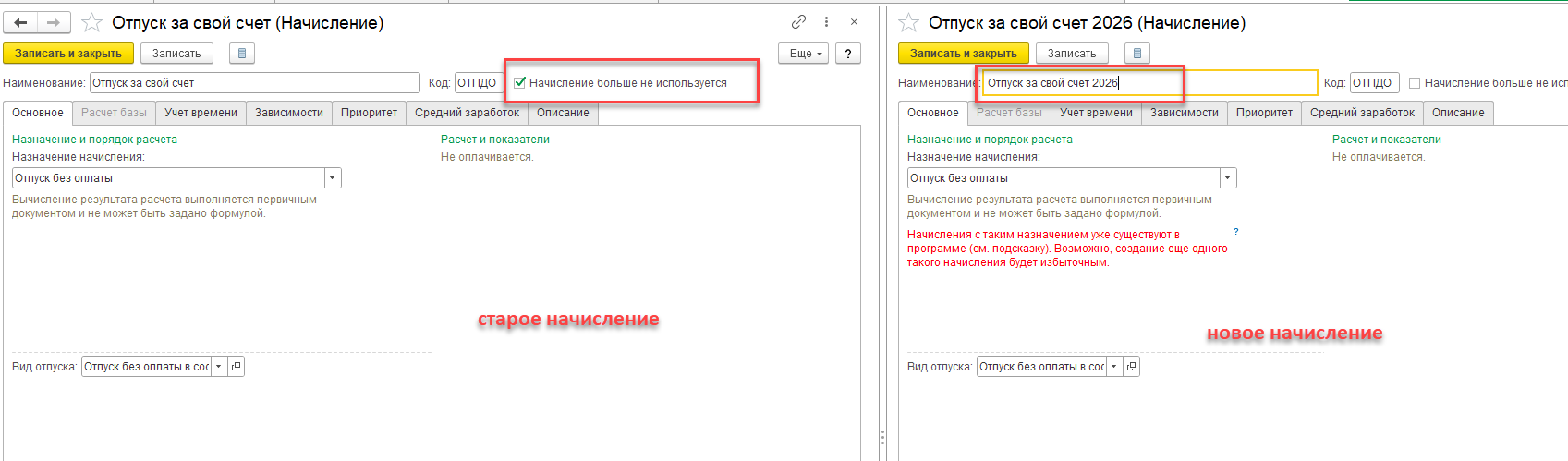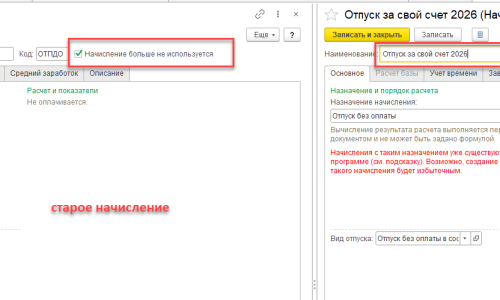 Если Вы хотите изменить данные по этим начислениям с 2026 года для расчета отсутствий, их не трогаем. Наименование в любом начислении можно сменить без последствий. Эти начисления использовались до 2026 года и учитывались по старым правилам. Если вставите 2026 год, тогда и в документах за прошлые года тоже будут эти новые названия.