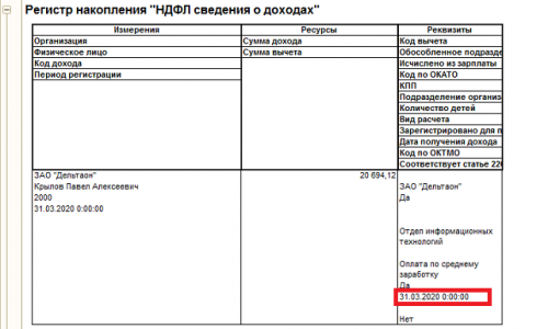 Ещё нужно проверить движения документа «Оплата по среднему», возможно в регистр накопления «НДФЛ сведения о доходах» попала дата получения дохода не 31.03.2020, а 03.02.2020.