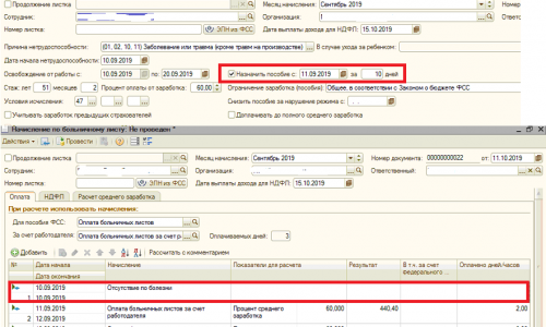 Здравствуйте! В документе «Больничный лист» в поле «Назначить пособие с» укажите следующий рабочий день. На закладке «Оплата» удалите строчку с начислением «Отсутствие по болезни».