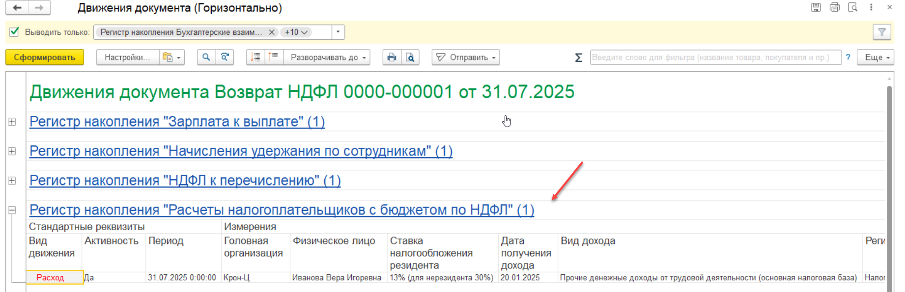 Чтобы легче было заполнить перенос данных, предлагаю сделать документ Возврат ндфл для сотрудника. Выбираем любого сотрудника из организации. После того, как заполним документ Перенос данных, Возврат ндфл отменим. Сумму лучше указать ту, которую будет возвращать физ.лицу. Проведем документ Возврат ндфл, но не закрываем. Далее по кнопке Еще-откроем Движение документов. Программа заполнит регистры