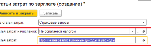 5. Всё верно. Программа работает так: видит в этом месяце был способ отражения, назовём его «91.02 Материальная помощь», в его настройке указан прочий расход «Прочие внереализационные доходы и расходы «, находит в регистре соответствий статей затрат (где мы ранее указали соответствие для страховых взносов) «Прочие внереализационные доходы и расходы » и ставит при проведении документа для страховых взносов «Не облагается налогом».