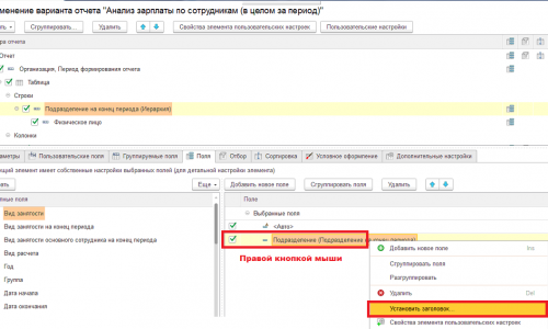 2) Нужно зайти в отчете в меню Ещё — Прочее — Изменить вариант отчета. По средствам элементов, указанных на скриншоте можно полностью перенастроить отчет. На объединение столбцов влияют настройки с закладки «Группируемые поля» и «Дополнительные настройки».