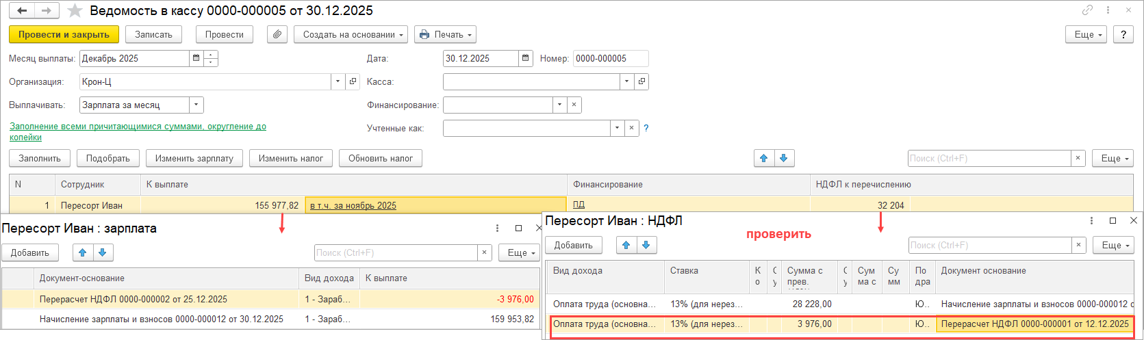 Здравствуйте, рассчитали отпускные за январь ( дата выплаты 30.12). Отпускные рассчитывали после начисления зарплаты, после пересчитали взносы в начислении зарплаты) , больничные за декабрь и зарплату за декабрь. Дата выплаты 30.12.Ведомости на выплату 30.12 последовательно заполняли