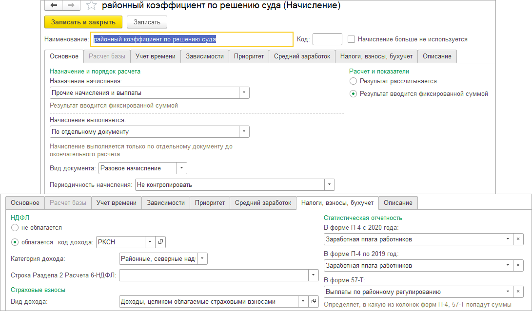 3. Для того чтобы настроить саму доплату районного коэффициента по решению суда можем также воспользоваться разовым начислением: