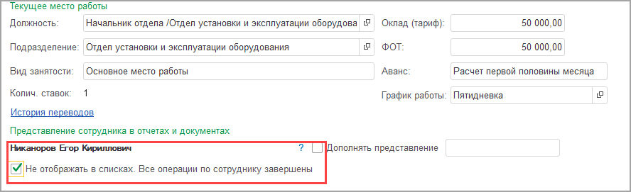 1. Может быть в карточке сотрудника поставлен флажок «Не отображать в списках. Все операции завершены».
