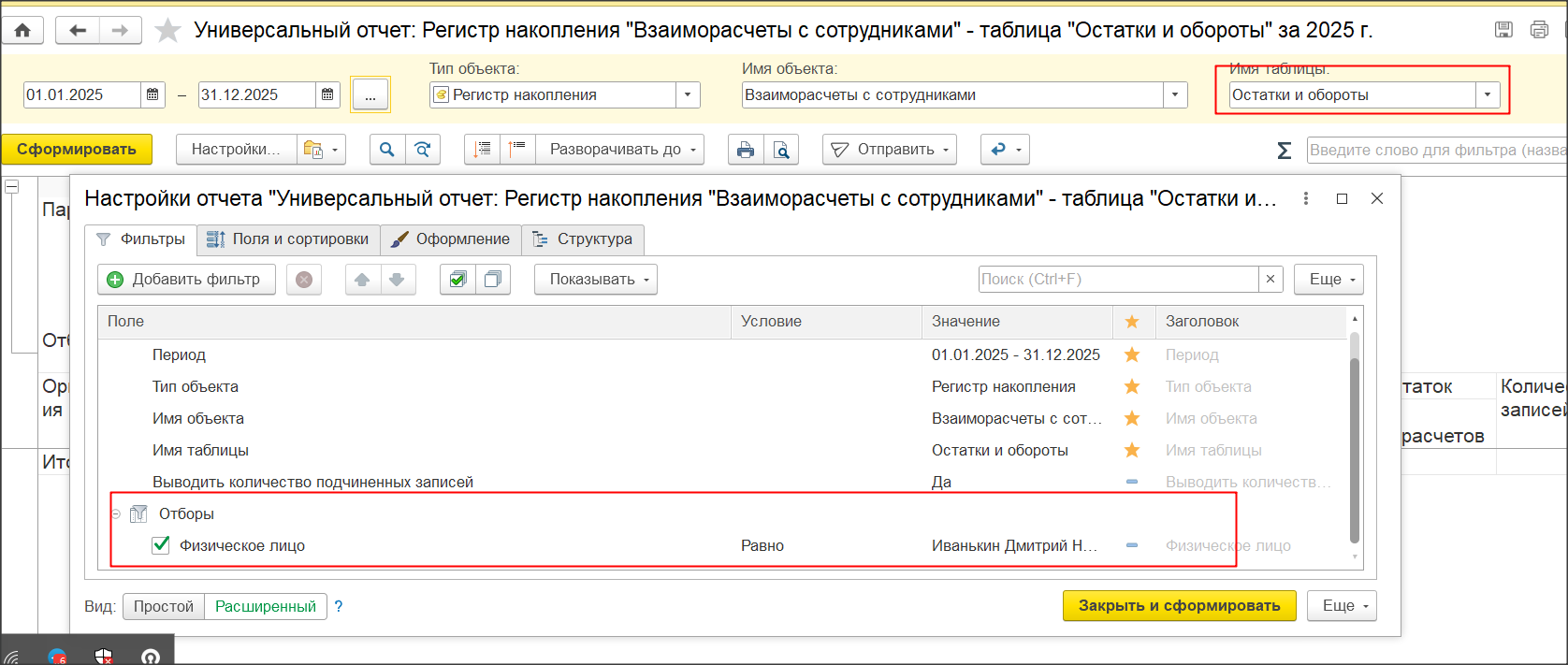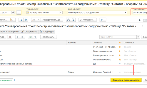 Если да, то давайте отменим и сформируем универсальный отчет по регистру Взаиморасчёты с сотрудниками, с видом Остатки и Обороты, с отбором по физлицу